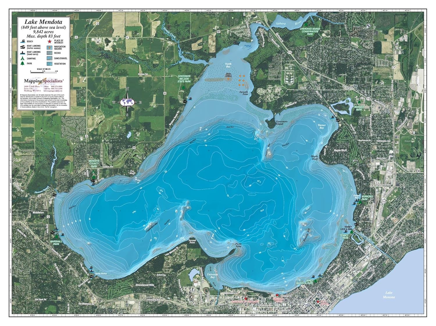 Fishing and Hydrographic Map of Lake Mendota, Dane County Mendota Fishing Map, Lake (Dane Co).